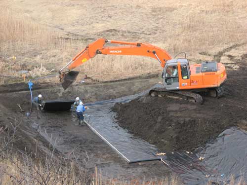 水源の沢水はザリガニも住み水質は良いのですが、水量が少ないのと砂質の土地であるために防水工事が必要になります。平成18年15㎡、平成19年300㎡の防水シート埋設の工事を行いました。土木工事が終了し、砂泥の窪地に水を湛えただけの殺風景な広がりに、子ども達の手で室蘭在来のトミヨやエゾアカガエルのおたまじゃくしを放流したり、潮風最前線に植樹するなどした結果、短期間で大変順調に自然回復が進んでいます。